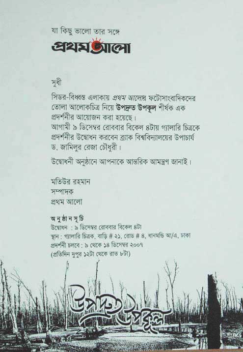 Photography Exhibition “SIDR” December 7, 2007August 12, 2008 ডাইরিLeave a comment Photography Exhibition “sidr” I would like to request you that please join our Photography exhibition on “Upodroto Upokul” please see our invitation card for details. -monir Share this: Email a link to a friend (Opens in new window) Email Share on X (Opens in new window) X Share on Monirul Alam (Opens in new window) Monirul Alam Share on Addtoany (Opens in new window) Addtoany Share on Facebook (Opens in new window) Facebook Share on LinkedIn (Opens in new window) LinkedIn Share on WhatsApp (Opens in new window) WhatsApp More Print (Opens in new window) Print Share on Reddit (Opens in new window) Reddit Share on Fliker (Opens in new window) Fliker Like Loading...