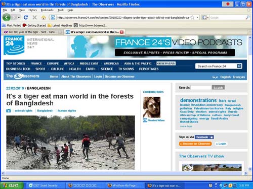 A wood-cutter was killed by a man-eating Bengal tiger in Bangladesh’s southern Sundarbans forest this month February 2010. The tiger killed Mabud 40, deep in the mangrove forest where collecting firewood in the area of char-shesher. Abul Sarder said, we five people enter the Jangle for collecting firewood suddenly the tiger attacked us- we narrowly escape but Mabud is not! We tried to safe him but failed from the tiger attack.