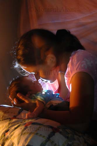 Dhaka. July 2010. A young Mother love her new born babies at midnight. Copy Right-Monirul Alam