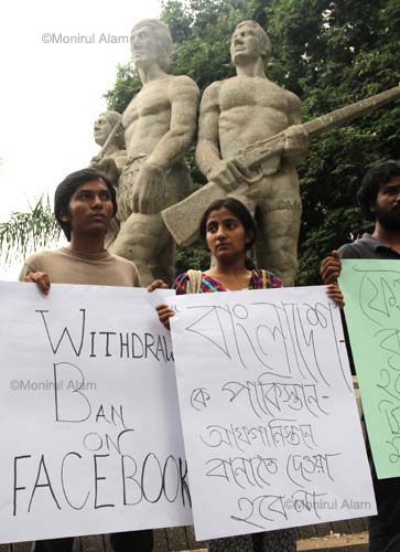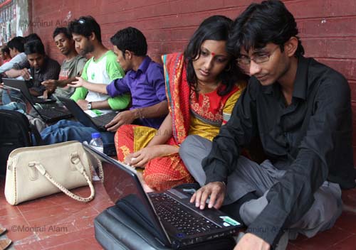 Dhaka May 2010. A group of Dhaka University students form a human chain on the campus to protest to block by the government the social networking site of Facebook. Copy Right-Monirul AlamDhaka May 2010. A Dhaka University students sit on the TSC corridor and work with laptop recently the social networking site of Facebook temporary blocked by the government. Copy Right-Monirul Alam