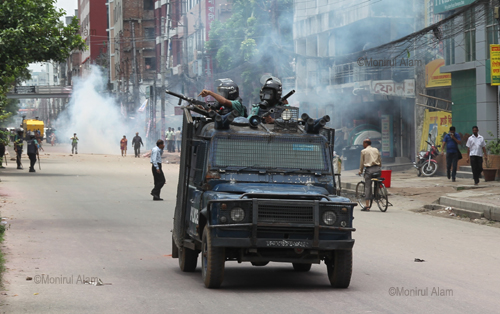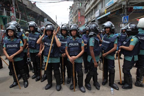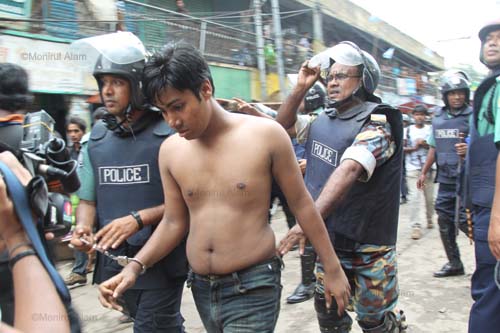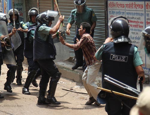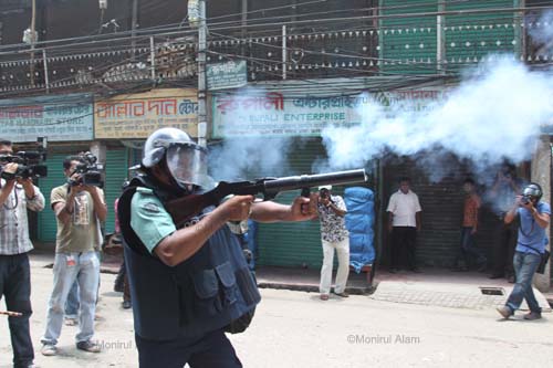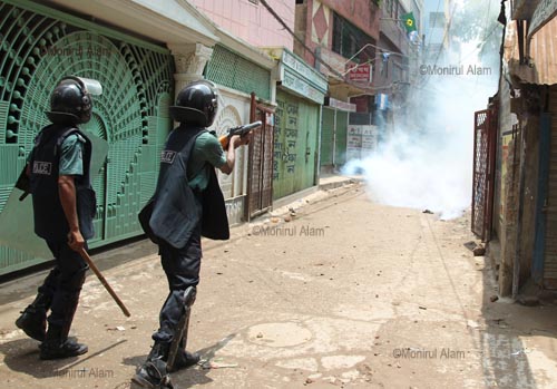 At least 30 people including 10 policemen were injured in a clash on Wednesday morning with readymade garment workers at Mirpur and Shewrapara in Dhaka. More than 10,000 protesting garment factory workers blocked main roads in the Mirpur the latest in a string of protests over low wages and poor conditions. Police fired tear gas and used water cannons to disperse the workers, who sew clothes for some of the top names in Western retail, after they blocked a major intersection in the north of the city.