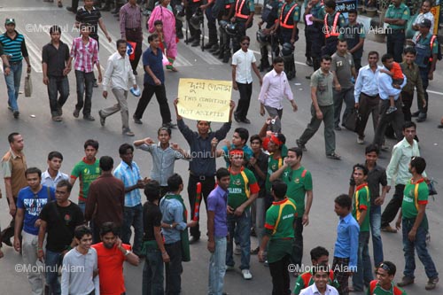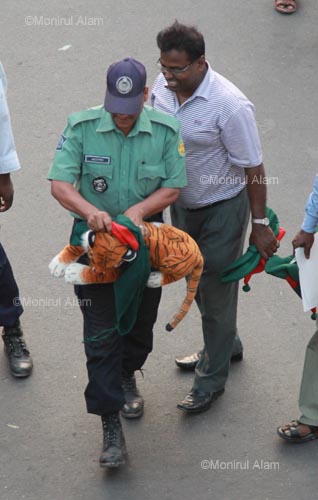 Dhaka,March 2011. Bangladesh's supporters shown a placard which write on “We are unhappy, this condition is not accepted.” after their nation's team lost their Cricket World Cup Group B match against West Indies at the Sher-E-Bangla National Stadium in Dhaka, Bangladesh on Friday March 4, 2011. West Indies beat Bangladesh by 9 wickets with 226 balls remaining. Phhoto:Monirul AlamDhaka, March 2011. Police seized a toy tiger and national flag from supporters who try to demonstrate against Bangladesh team. Bangladesh lost their Cricket World Cup Group B match against West Indies at the Sher-E-Bangla National Stadium in Dhaka, Bangladesh on Friday March 4, 2011. West Indies beat Bangladesh by 9 wickets with 226 balls remaining. Phhoto:Monirul Alam