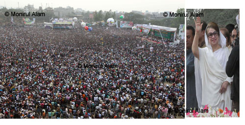 08 Jan. 2012 .Bangladesh- BNP Chairperson Khaleda Zia waves a gathering of thousands of opposition leaders and activists at the Polo Ground in Chittagong on Monday. She is leading the party’s road march to Chittagong from the capital on Sunday, aiming to drum up public support for reinstating the caretaker government system © Monirul Alam