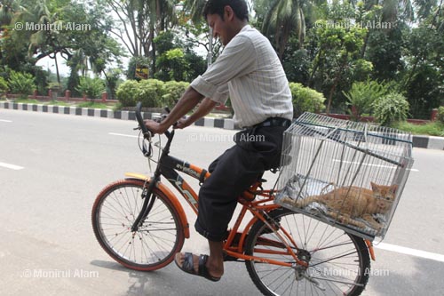 17 May 2012 Dhaka. Bangladesh- Mostofa, a caretaker who ride bicycle with his owner cat name Mini cat. He back from the veterinary hospital after Mini’s treatment during the down to dusk strike hour in Dhaka. The main opposition party BNP has enforced the strike demanding the release of their top leaders jailed in a case over alleged arson during earlier general strikes, Most of the business establishments, shops, school and colleges remain closed during the strike.© Monirul Alam