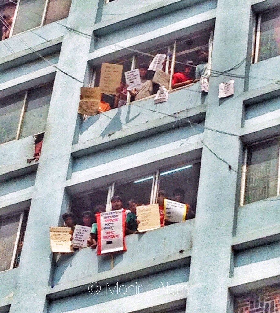 06082014 [ Daily Life ] #Garment workers of #Tuba Groups stand in the 5th floor as they hold banners reading ‘implement our demands soon and we will not go home unless fulfiled our demands’ as the main entrance gate was blocked where some workers are continuing a hunger strike in Dhaka, Bangladesh, 06 July 2014. More than 1,500 workers at five other factories have been on hunger strike demanding three months of unpaid wages and holiday.