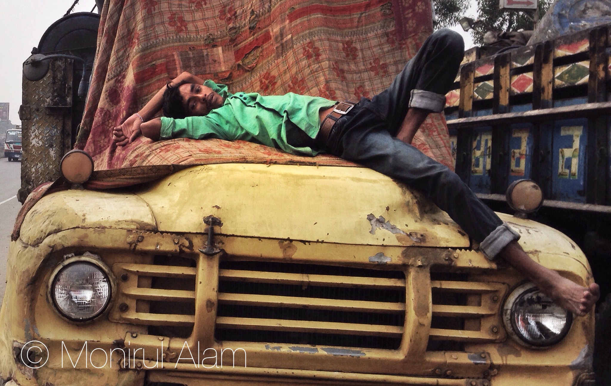 ট্রাকের হেলপার বাক্ প্রতিবন্ধী নাসের অবরোধের ২য় দিনে ট্রাকের উপর শুয়ে আছেন । ৫ই জানুয়ারি নির্বাচনের বর্ষপূর্তিতে ঢাকায় সমাবেশ করতে না দেয়ায় ২০ দল সহো প্রধান রাজনৈতিক দল বিএনপির লাগাতার অবরোধ কর্মসূচির পালন করছে ছবি: মনিরুল আলম