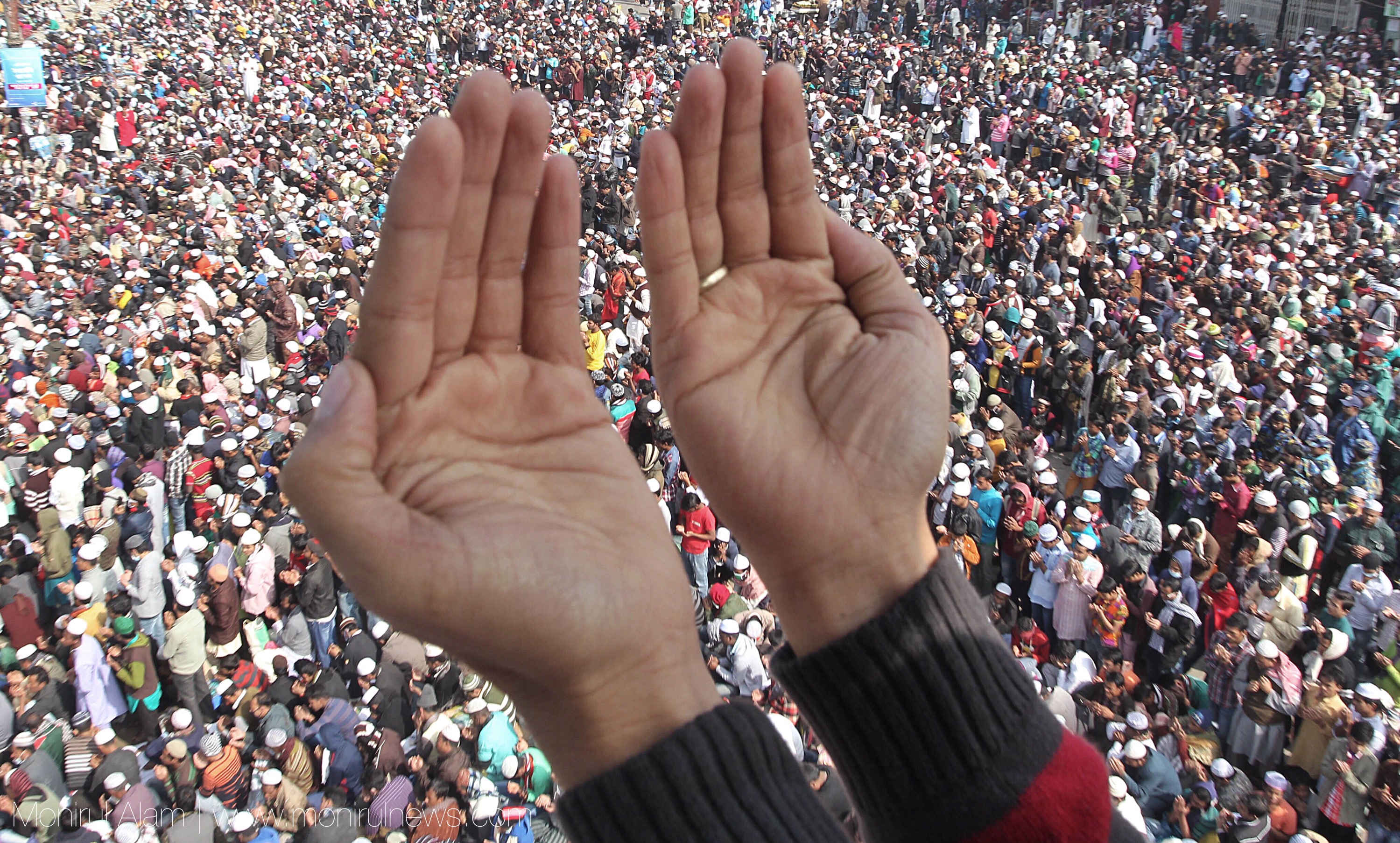 বিশ্ব ইজতেমায় অংশগ্রহণকারী লাখো মুসুল্লী আল্লাহর কাছে হাত উচিয়ে আখেরি মোনাজাতে অংশ নেন। বাংলাদেশে বিরোধী দল বিএনপির ডাকা অবরোধ কর্মসূচির মাঝেই শেষ হলো তাগলিগ জামাতের তিনদিনের বিশ্ব ইজতেমা । রোববার সকালে আখেরি মোনাজাতের মধ্য দিয়ে সমাপ্তি ঘটে ইজতেমার প্রথম পর্ব। এতে অংশ নেন বাংলাদেশের এবং পৃথিবীর বিভিন্ন দেশ থেকে আসা মুসলমানরা।বিশ্ব ইজতেমাকে বলা হয় হজ্বের পরে মুসলমানদের সবচেয়ে বড় ধর্মীয় জমায়েত। ছবি: মনিরুল আলম