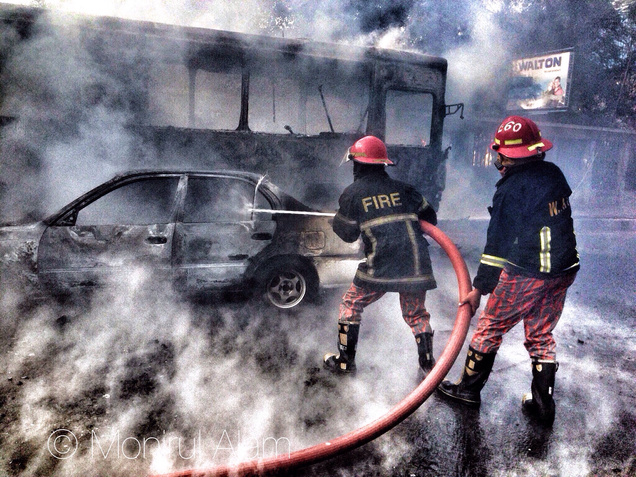 সম্প্রতি অবোরধ চলাকালে নগরীর রাজউক ভবনের সামনে একটি বিআরটিসি এবং একটি প্রাইভেট কারে দুবিত্তরা আগুন দিলে ফায়ার সাভর্িসের লোকেরা আগুন নিভিয়ে ফেলছেন।