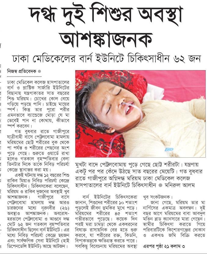 ঢাকা মেডিকেল হাসপাতালের বাণর্ ইউনিটে ১২ বছরের অগ্নিদগ্ধ বাসের হেলপার নাজিমুদ্দিন হাসপাতালের বিছানায় সুখে আছে । সে গত ৪ জানুয়ারি ভোর রাতে উত্তরা এলাকায় বাসে ঘুমিয়ে থাকা অবস্থায় অগ্নিদগ্ধ হয়।