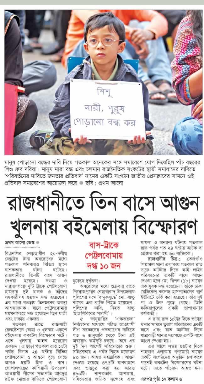আগুনে পুড়িয়ে মানুষ হত্যা বন্ধ ও রাজনৈতিক সংকটের স্থায়ী সমাধানের দাবিতে জাতীয় প্রেসক্লাবের সামনে আয়োজিত প্রতিবাদ সমাবেশে অংশ নেয় পাঁচ বছরের এই ছোট্ট শিশু ধ্রুব দরিয়া । পরিবর্তনের দাবিতে জনতার প্রতিবাদ নামের একটি সংগঠন আজ এ প্রতিবাদ সমাবেশের আয়োজন করে।