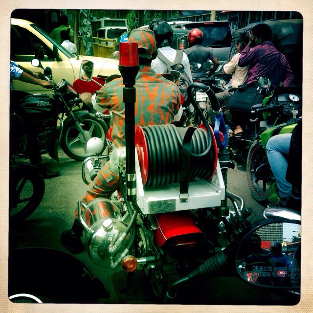14 May 2015 Dhaka Bangladesh A firefighter sit on the motorcycle during the long traffic jam in the capital of Dhaka.Photo by Monirul Alam