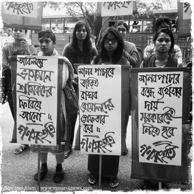 18 May 2015 Dhaka, Bangladesh. Ganasanghati Andolan leaf wing party members holding a poster in front of national press club in the city on 18 May,they demanded immediate action to rescue Bangladeshi would-be migrants who are left ‘floating’ off the coasts of Thailand and Malaysia, as well as stern punishment against human traffickers for their heinous crimes. Photo by Monirul Alam