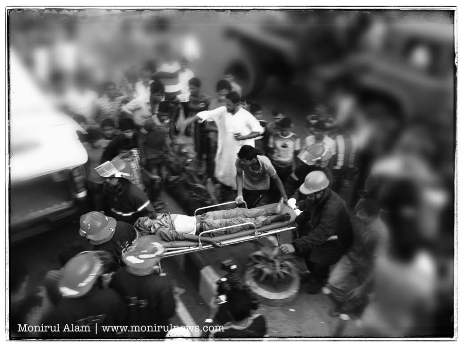 A passenger bus has overturned while racing another on traffic free road in the central Dhaka, Bus helper spot dead several other injured. when a bus fell on its side while racing against another one on Kazi Nazrul Islam Avenue opposite the CA Bhaban at Karwanbazar in the city on 03 June, 2015.