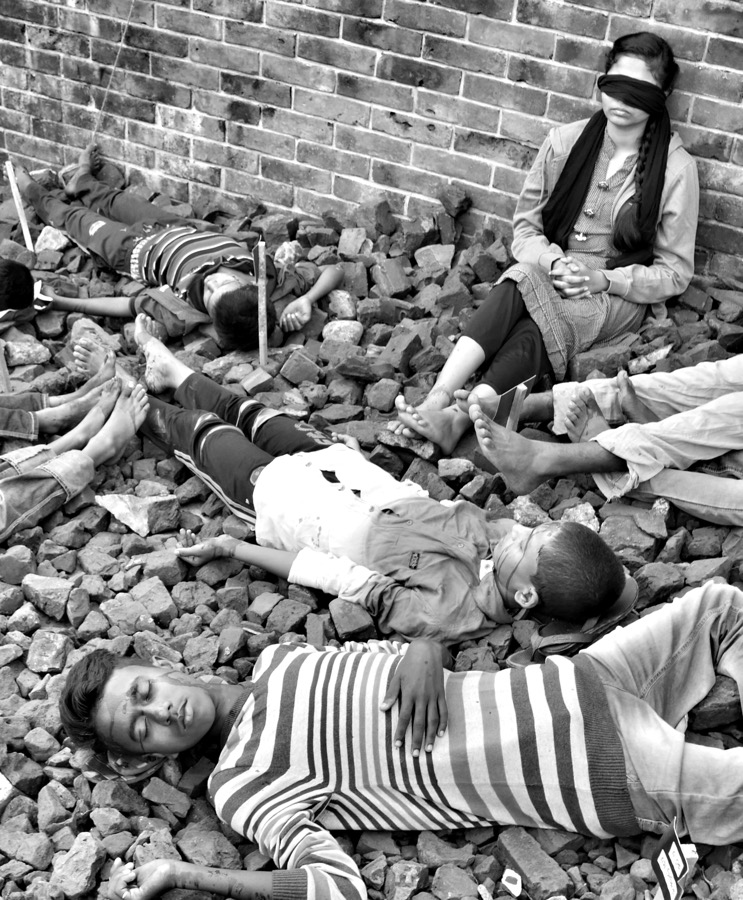 Dhaka, Bangladesh. 14th December 2015 -Children down enacting the death of thousands of intellectuals killed during Bangladesh’s 1971 Liberation War against Pakistan.The 14th December is observed as the Intellectual Martyrs Day in memory of Bengali intellectuals killed by Pakistani forces during the 1971 Liberation War. © Monirul Alam
