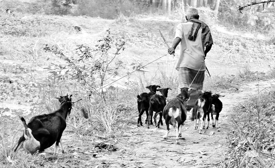 Hijulia, Manikgonj, Bangladesh, December, 2015— A villager flocks of his goats for feeding in the winter morning at the village of Hijulia. This week our family member visit in our beautiful village and enjoy the winter season. A winter morning is misty and cold. There is dense fog everywhere. Sometimes the fog is so dense that the sun rays cannot seen. People in general and children get up late in a winter morning we enjoy delicious and sweet baker. Payer of date juice and many other things.