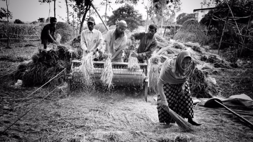 Hijulia, Manikgonj, Bangladesh- A group of Bangladeshi farmers processes paddy at the village of Hijulia, Manikgonj, Bangladesh on 28 May, 2016. The government of Bangladesh fixed the prices at Tk 23 and Tk 32 per kilogram of paddy and rice respectively, while the rate of per kg of wheat is set at Tk 20. A plurality of Bangladeshis earn their living from agriculture. Although rice and jute are the primary crops, wheat is assuming greater importance. Photo: Monirul Alam