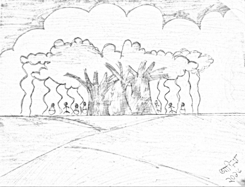 কাজ শেষ করে গাইবান্দা থেকে ঢাকায় ফিরলাম । আমাদের ক্ষুদে শিল্পী—আদিবা’কে বলালম, তুমি আমাকে, ‘তিন গাছ তলা’ একটা ছবি একে দাও তো ! যেখানে তিনটা বট গাছ থাকবে, একটা সুন্দর ল্যান্ডস্কেপ । সে পুরো ব্যাপারটা বুঝে নিয়ে,তার মতো করে একটা স্কেচ করে দিল—আমাকে। আদিবার আঁকা এই স্কেচটি এখানে ব্যবহার করলাম ।