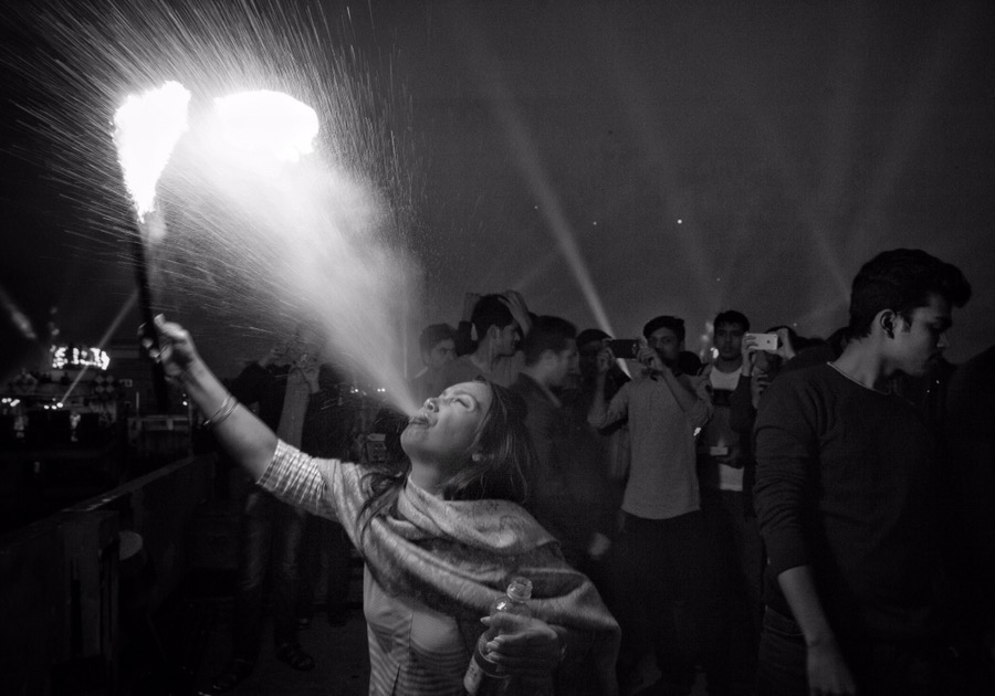 January 14, 2017 – Dhaka, Bangladesh – A woman spits fire on the last day of Bengali month Paush. This traditional festival is locally known as Sankranti. People of the old Dhaka celebrate Shakhrine with colorful kite flying during the day and fire eating and performances after dark.