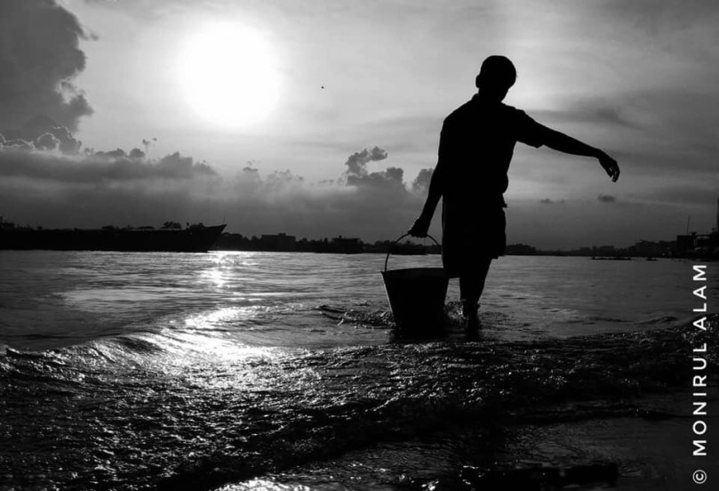 বর্ষার পানিতে বুড়ীগঙ্গা নদীর অন্যরকম সৌন্দর্য আমার চোখ এড়ালো না ! নদীর পাড়টিতে ছোট ছোট ঢেউ আছড়ে পড়ছে; সূর্যের আলোতে সেসব ঢেউ গুলো অদ্ভুত সুন্দর লাগছিল ! আমি চিন্তা করলাম— এখানে খুব সুন্দর সিলুয়েট ( Silhouette ) ছবি হয় । আসলে সিলুয়েট ফটোগ্রাফী করতে যা যা দরকার তার সব এলিমেন্ট গুলো এখানে খুঁজে পেলাম । আমি সিদ্ধান্ত নিলাম এখন কিছু সিলুয়েট ছবি তুলবো ।