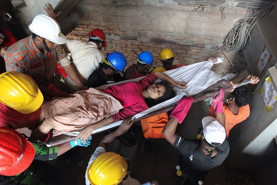 Garments Factory Collapse – APR. 24, 2013 – A group of firefighter’s rescue a garments worker who trap on the nine store collapse building. The building collapse occurred in Savar, a town of the national capital, Dhaka, and is the latest accident to badly affect Bangladesh’s garment industry. At least 1200 people were killed many more trapped inside a mountain of jumbled concrete debris and over 2,400 injured in Savar on the outskirts of the capital on 24 April 2013 Wednesday morning when a nine-storey building housing five garment factories collapsed. Rescuers fear the death toll may rise significantly. Local citizen, fire fighters and army personnel joined police and volunteers to rescue those trapped under the debris. A number of workers of four garment factories in Savar alleged that they were forced to work in the morning. © Monirul Alam