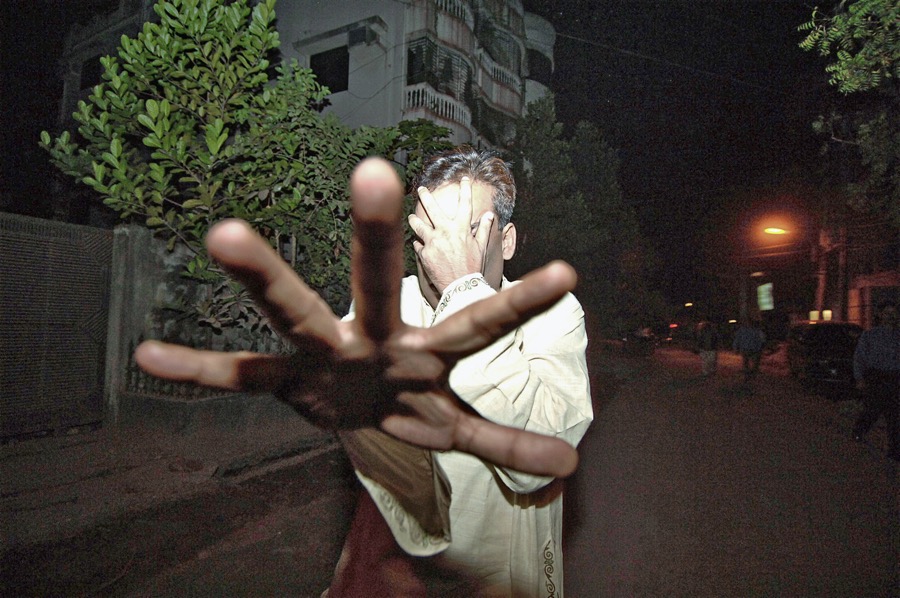 Secret Meeting – Oct. 24, 2006 – A group of former and in-service senior civil servents, who joined a secret meeting hosted by former energy adviser Mahmudur Rahman at his Uttra business office on night on 24 October, 2006, Dhaka, Bangladesh. When media was present than meeting is postpond and most of the govt.officials tries to hide their face. The incident as a part of a possible attempt to election engineering. © Monirul Alam