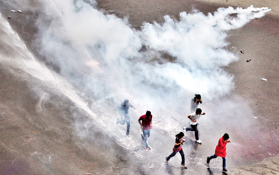 Break up Demonstration: SEP. 17, 2014—Bangladeshi police use tear gas and water cannon to try to break up a demonstration against a court ruling commuting the death sentence of Jamaat-e-Islami leader Delwar Hossain Sayedee in Dhaka, Bangladesh, 17 September 2014. Bangladesh’s highest court commuted the death sentence on a top Islamist preacher. In a surprise ruling, the Supreme Court said 74-year-old Delwar Hossain Sayedee should spend ‘the rest of his natural life’ in jail for crimes during the 1971 liberation war with Pakistan. © Monirul Alam