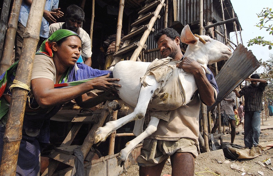 Evocation Drive : JAN. 27, 2007 – A man try to scape to his pregnant goat for the safety places during the evocation drive in the area of Kamrangirchar, Dhaka, Bangladesh.Bangladesh Inland Water Transport Authorities, BIWTA conducted an eviction drive at Kamrangirchar near Buriganga River, following am high Court order to free illegal structure. © Monirul Alam