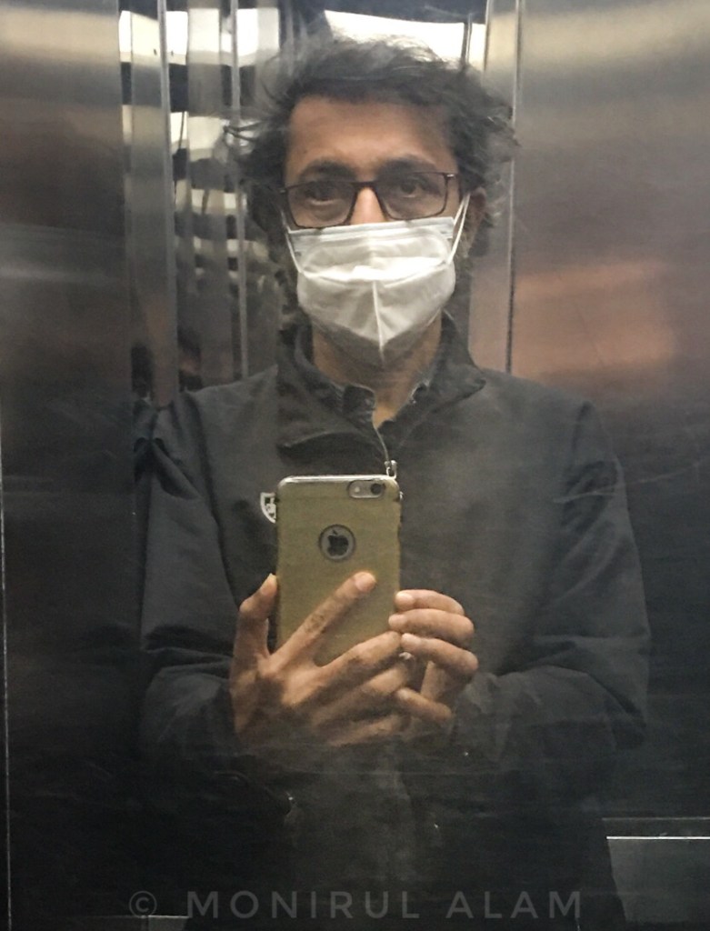 সেদিন শান্তি নগর গিয়েছিলাম । একটা ব্যক্তিগত কাজ ছিল । লিফট দিয়ে নামছি— লিফটের গ্লাসে আমারই প্রতিচ্ছবি ভেসে উঠেছে, সেটা আমার নজরে এলো । মাস্কের আবরণে মুখের অর্ধেকটা ঢাকা পরে আছে, কিছুটা যেন অস্পষ্ট, অচেনা লাগছিল নিজের আত্মপ্রতিকৃতিটি দেখে ! মোবাইল ক্যামেরাটি দিয়ে মুহুর্তটির ছবি তুলে রাখলাম ।