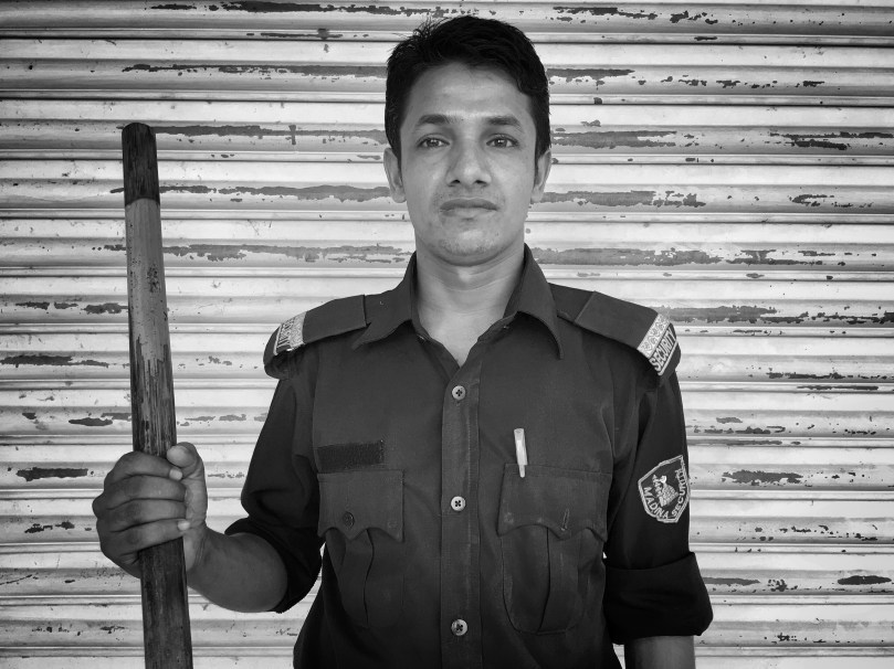 তার নাম—আল-আমিন । দেশের বাড়ী কুমিল্লা, বুড়িচং । মদিনা গ্রুপের নিরাপত্তা কর্মী হিসাবে কাজ করছেন । তিন মাস হলো ঢাকায় এসেছেন, এই পেশায় কাজ করছেন । আমি তার মজার মজার কথা শুনে তাকে বলালম, আমিন ভাই, আপনার একটা ছবি তুলি ? সে বলল, না ভাই আমি ছবি তুলি না । আমি তাকে বলালম, মুরব্বীরা অনুরোধ করলে সেটা রাখতে হয় । সে রাজী হলো, তার বেশ কয়েকটা ছবি তুললাম । সে ছবি গুলো দেখতে চাইল, তারপর বলল,ছবি গুলো ভালো লেগেছে তার । আমি তাকে বললাম, আপনি তো ছবি তুলতে চাইলেন না প্রথমে । সে খুব সুন্দর করে একটা হাসি উপহার দিল আমাকে ! তার কাছ থেকে বিদায় নিয়ে ছাতা মাথায় দিয়ে ফিরে চললাম আমার নিজস্ব গন্তব্যে ।
