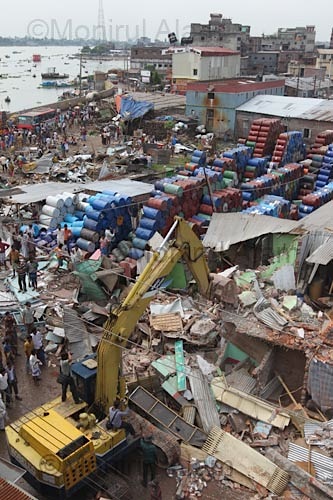 Dhaka Buriganga River September 2010. Bangladesh Inland Water Transport Authority BIWTA demolish illegal shop on their land at Shoarighat near the bank of Buriganga river. More than seventy structures demolish lead by Dhaka District Magistrate Mohammad Kamruzaman with fire service, RAB and Police.Copy Right:Monirul Alam
