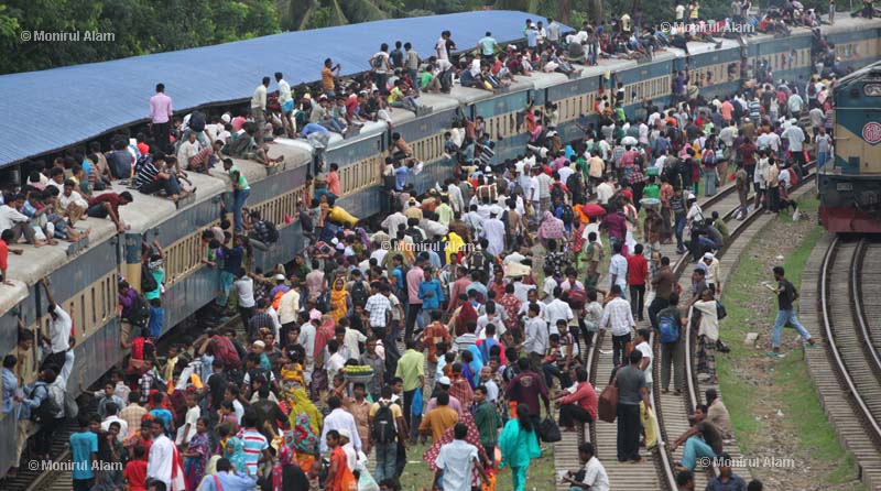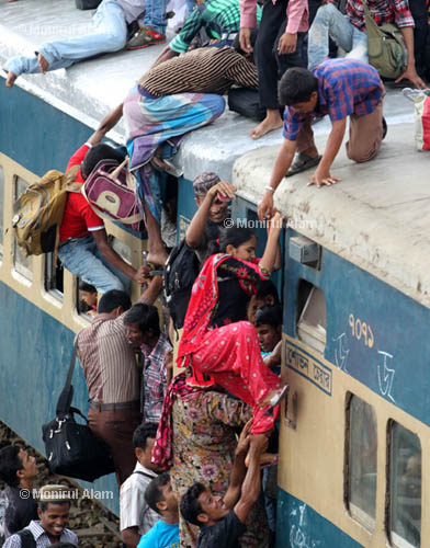 The commuter train will become form the Dhaka station and go to other district. On the station I look around a group of garment worker sit on the station platform and they are gossiping each other. I talked with them, one of garment workers Rehana Begum said, we are waiting for Dawangonj based train, we know inside the train full of passengers, we don’t have any other alternate way to go our village; so we prepared to ride on the train roofs for our Eid traveling- we are used too, that kind of journey.