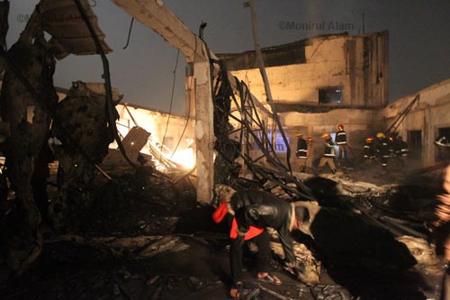Hole area is black out huge number of eager people rush on the area to observed the situation. The security person stand on the spot and firefighters all ready works. I saw one charred body lie-in on the road with a pice of cloth after that I enter the factory.