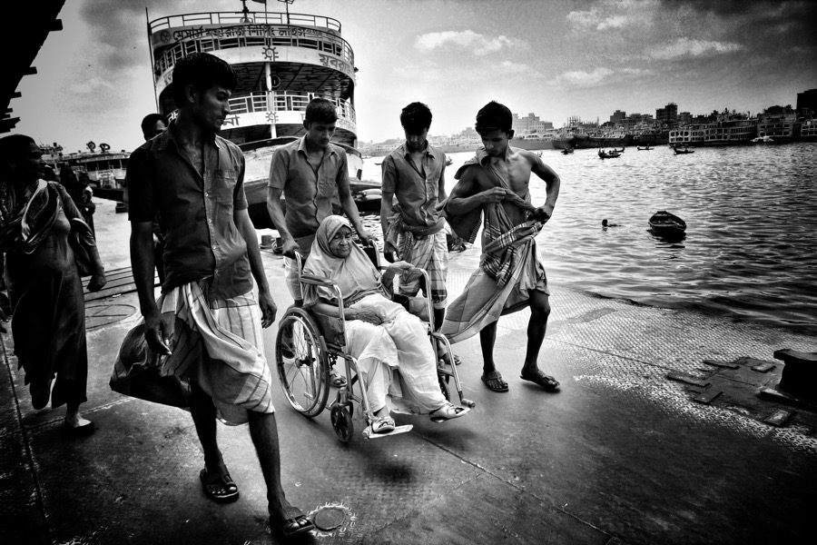 Reportage @ 22 April, 2016 People still suffering water transport workers strike in Bangladesh. An old age women sit on the wheel chair and leave from the launch terminal to other way. River transport workers enforced an indefinite strike to press hone their 15-point demand, including pay hike. © Monirul Alam