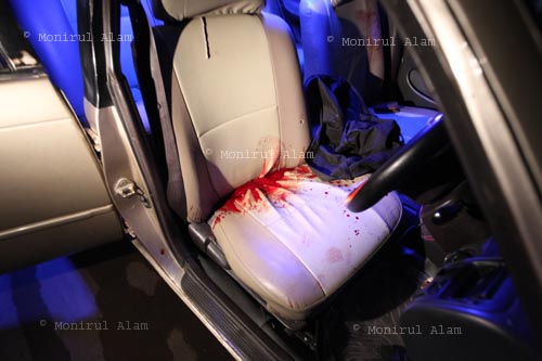 On the spot I took a picture a private car with blood spotted on the sits, broken car widows with bullet holes at the same time I took several pictures which I remarked. When I talked one witness he said, soon after fired pedestrian ran away in panic after that the law enforces cordoned off the spots and media was covered. I saw number of local’s gather and to watching the situation some time security forces try to left the scene but curious people still stand and watching. Within half an hour’s I leave on the spot and move to Dhaka Medical College to cover on 5 deceased.