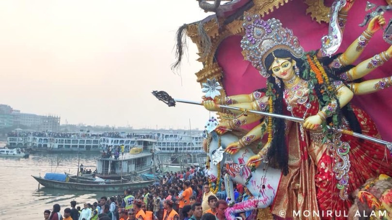 শাখারী বাজার, পাটুয়াটুলি হয়ে হাঁটতে হাঁটতে চলে এলাম সদরঘাট—বুড়ীগঙ্গা নদীর তীরে । বিনা স্মৃতি ঘাটে প্রবেশ করতেই মনটা এক অদ্ভুত ভালো লাগায় পেয়ে বসলো ! নদীটির পশ্চিম আকাশে তাকাতেই দেখলাম সূর্যটি ততোক্ষণে লালা রং ধারণ করেছে—আজকের মতো সে বিদায় নিচ্ছে এই ধরাতল থেকে আর তার এই বিদায়ের সঙ্গী হয়েছেন—দূর্গা দেবী !
