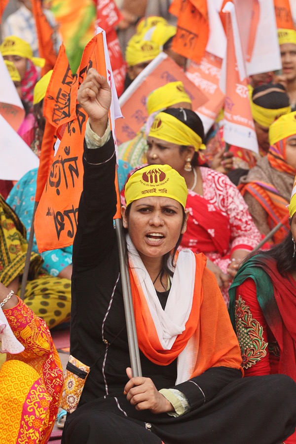 Nov. 25, 2015 – Dhaka, Bangladesh – Women activists protest demanding elimination of violence against women on the occasion of the International Day for the Elimination of Violence Against Women in front of Central Shaid Minar in Dhaka.Recent global prevalence figures (WHO) indicate that 35% of women worldwide have experienced either intimate partner violence or non-partner sexual violence in their lifetime. In 2013, the Bangladesh Bureau of Statistics (BBS) with support from UNFPA released a national survey of violence against women that found that 87 percent of ever married women have experienced some form of violence in their lifetime with 77 percent reporting violence in the past 12 months.
